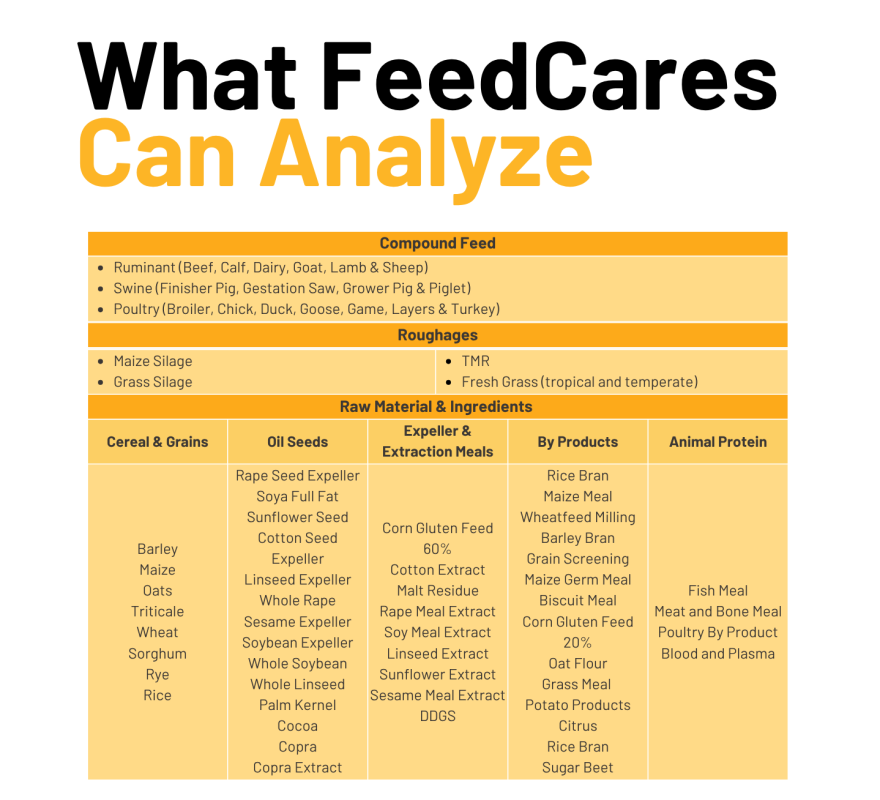 Our FeedCares Solution uses Near Infrared Spectroscopy (NIRS) technology linked to the global feed database to determine qualitative parameters of feed materials and forage quickly.