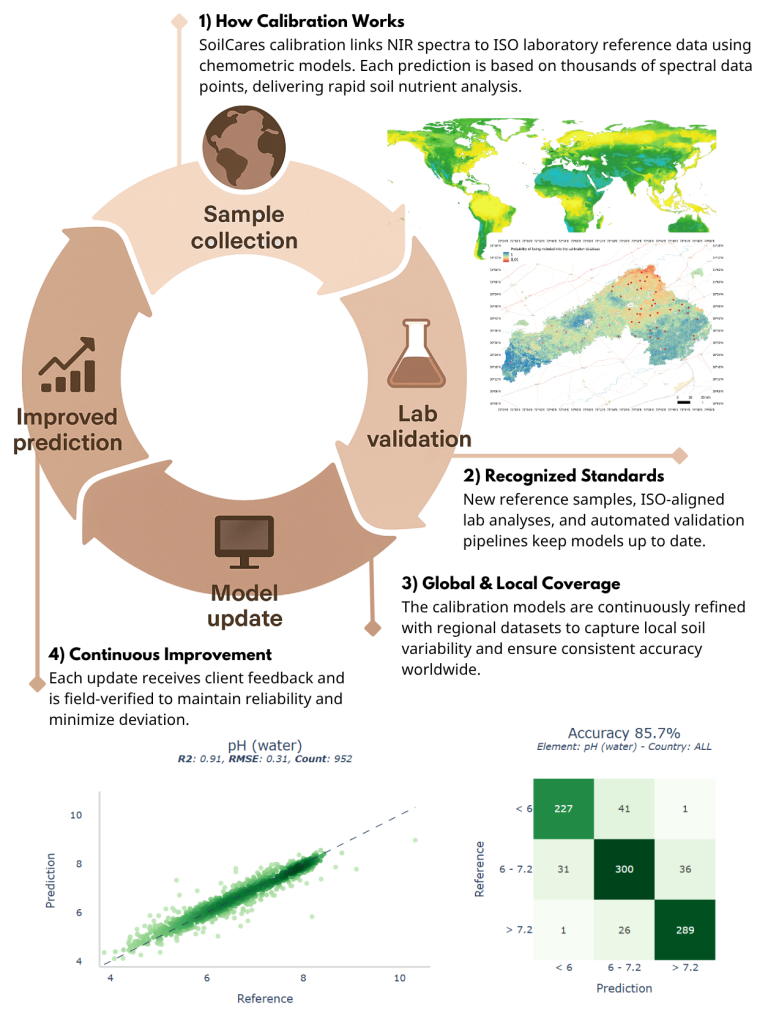 Every soil is unique: shaped by its parent material, climate, management, and organic activity.To capture this complexity, the SoilCares calibration process transforms raw spectral data into reliable, agronomically valid nutrient information.